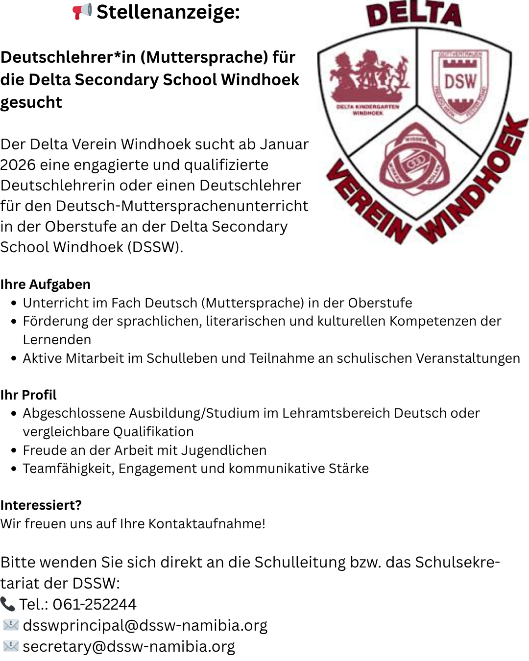Der Delta Verein Windhoek sucht ab Januar 2026 eine engagierte und qualifizierte Deutschlehrerin oder einen Deutschlehrer für den Deutsch-Muttersprachenunterricht in der Oberstufe an der Delta Secondary School Windhoek (DSSW).